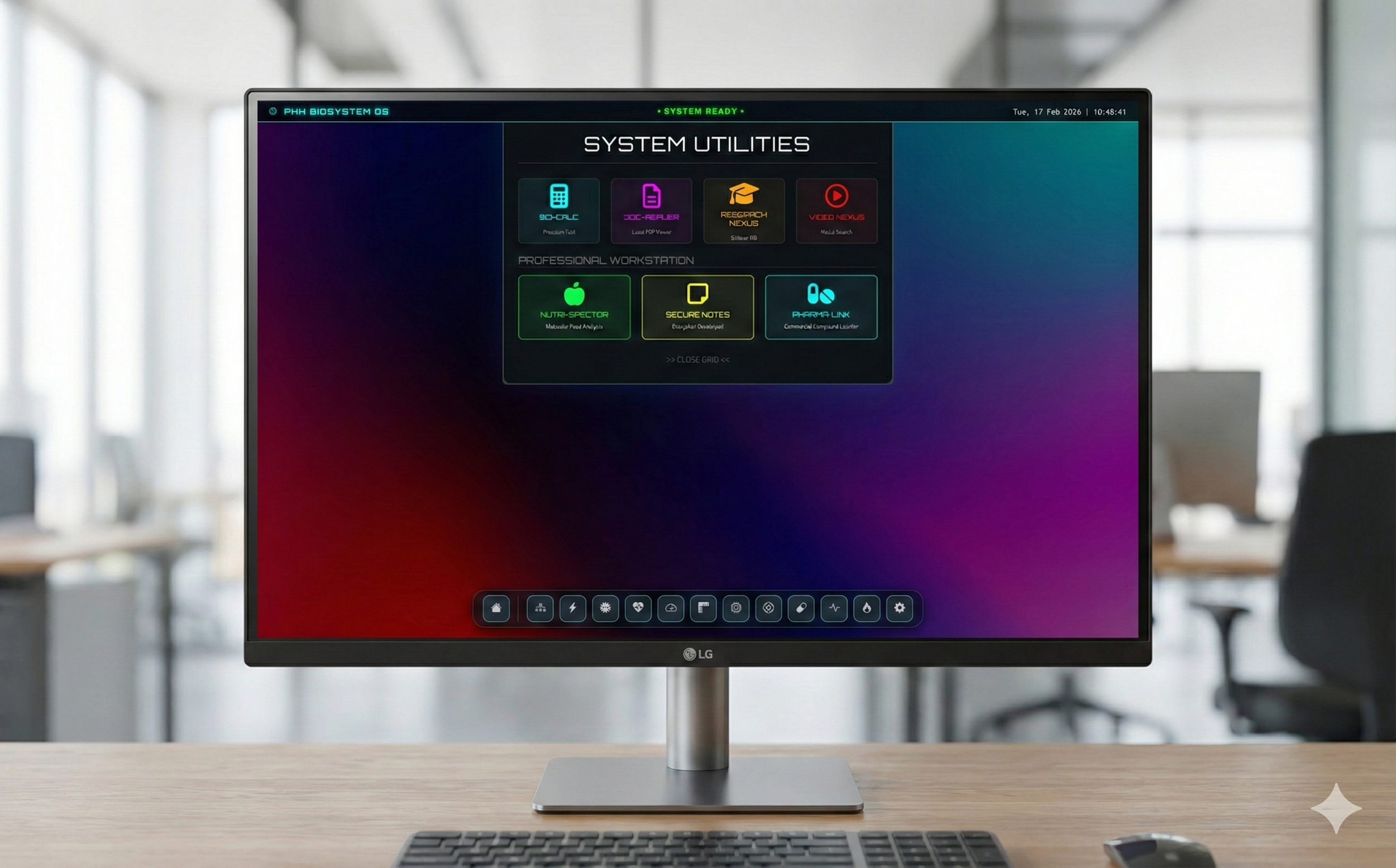 Olvídate de saltar entre veinte pestañas del navegador. Calculadoras, acceso a papers (Research Nexus), notas encriptadas y análisis molecular (Nutri-Spectra)... todo vive dentro de tu OS.